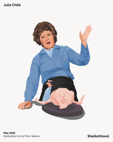 For this piece, I illustrated Julia based on a still from her show The French Chef—a moment I imagined her saying something hilariously cheeky like, “Now you must pick a big breast, big breast is best!” I placed her in the kitchen I grew up in—the one my mom still cooks in today—creating a mashup of past and present that honors the way both women have shaped my life through creativity, conviction, and care.